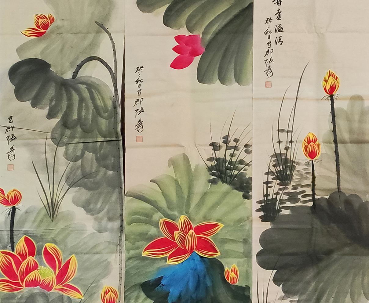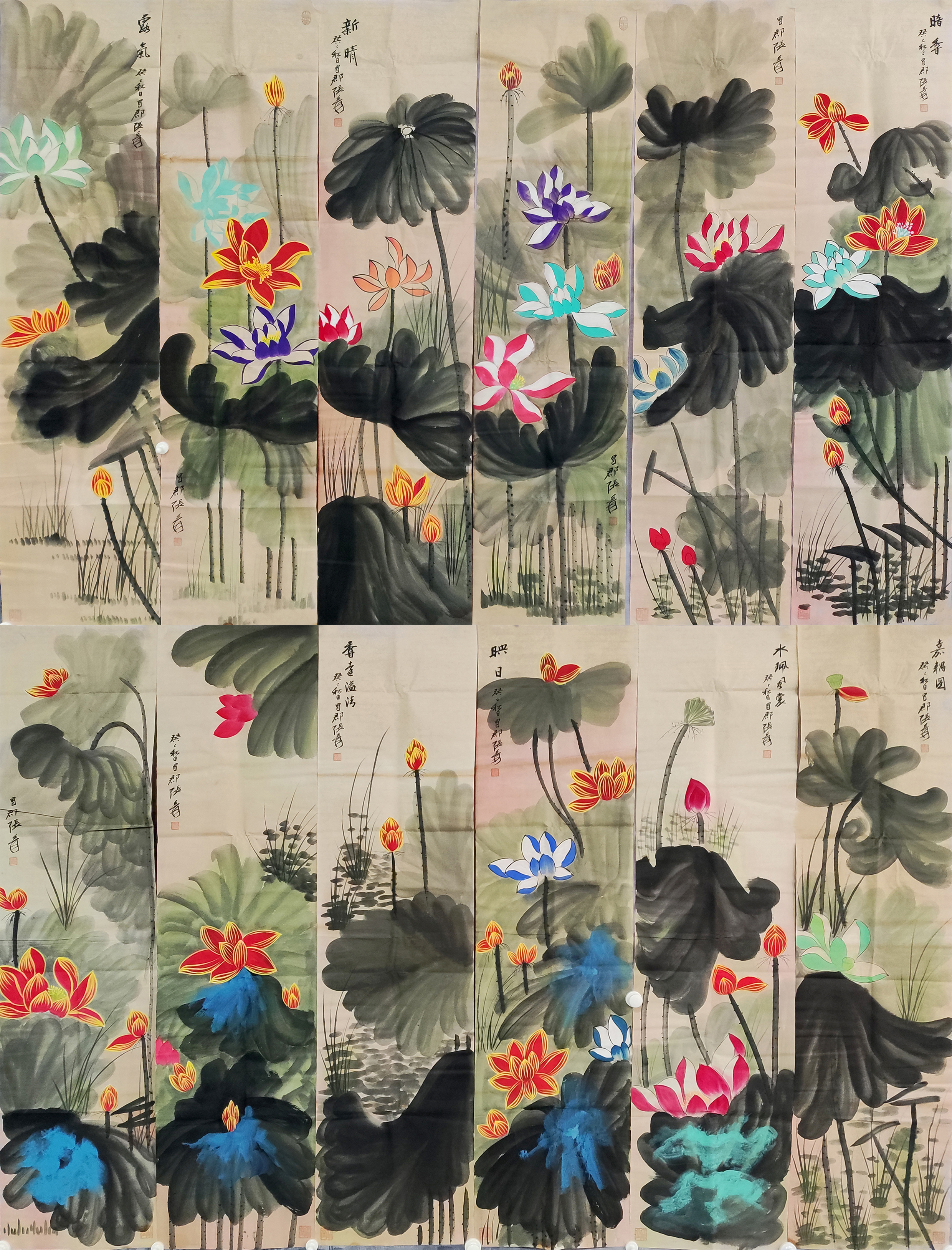 国画:荷花十二条屏