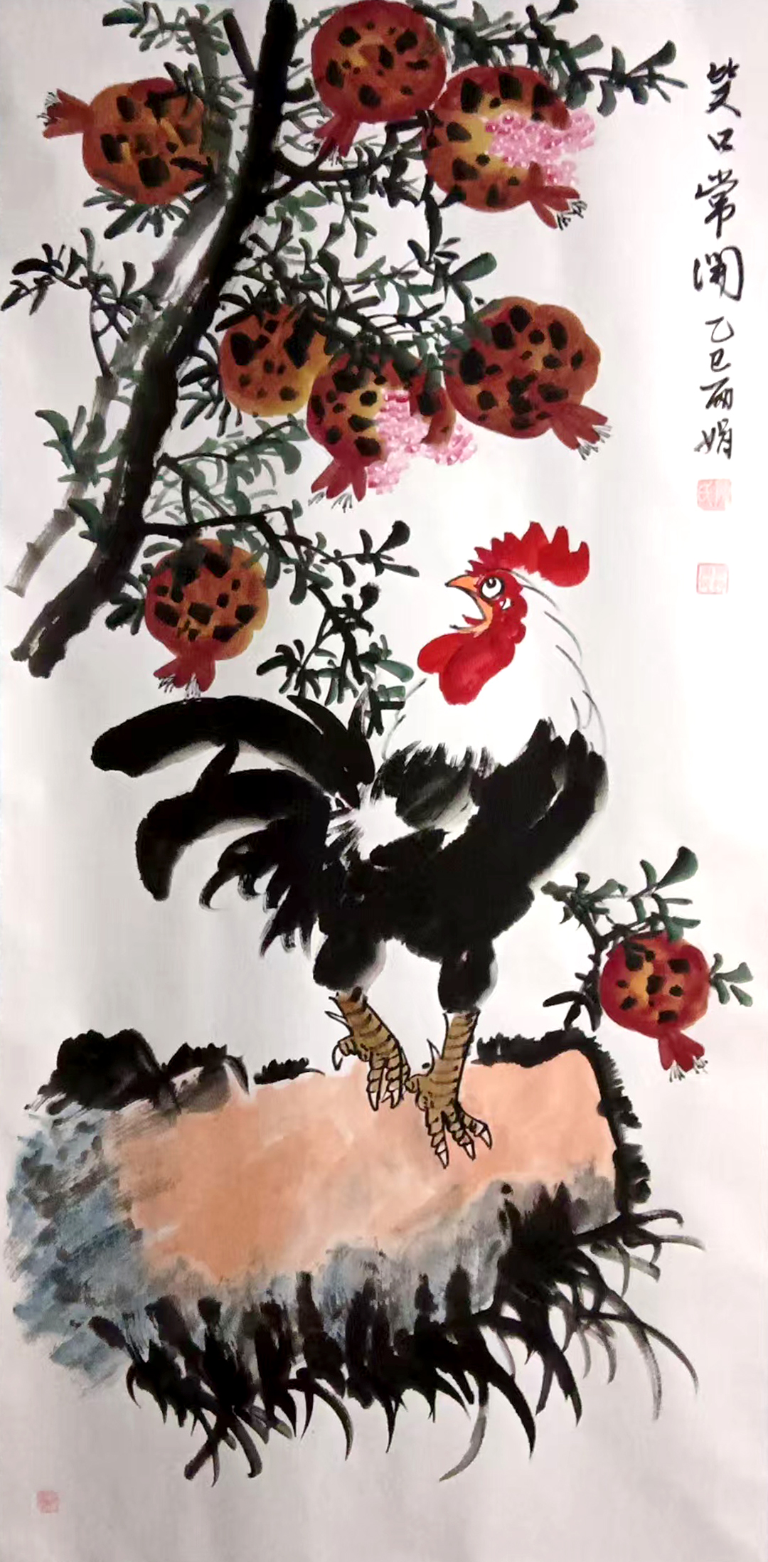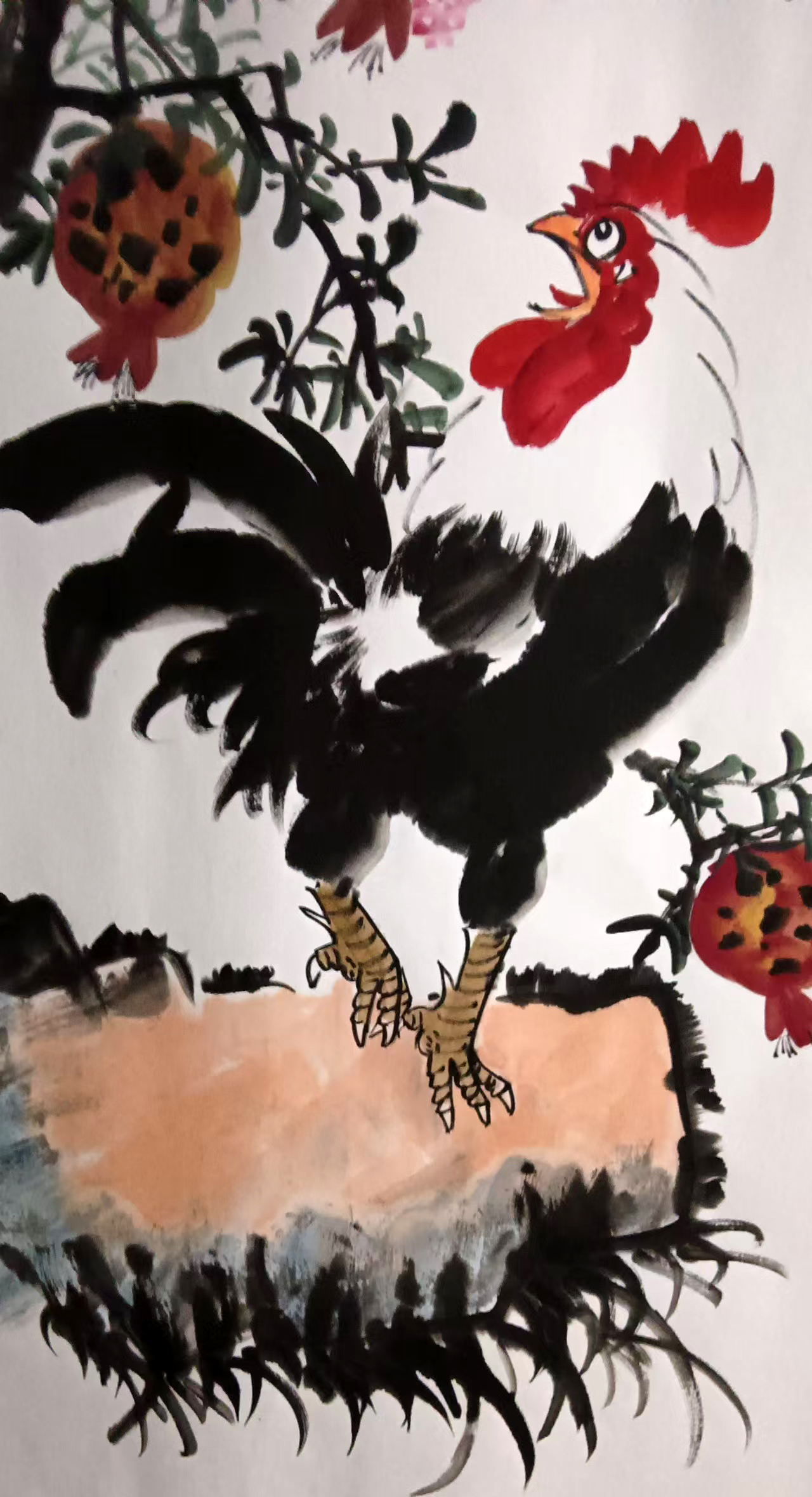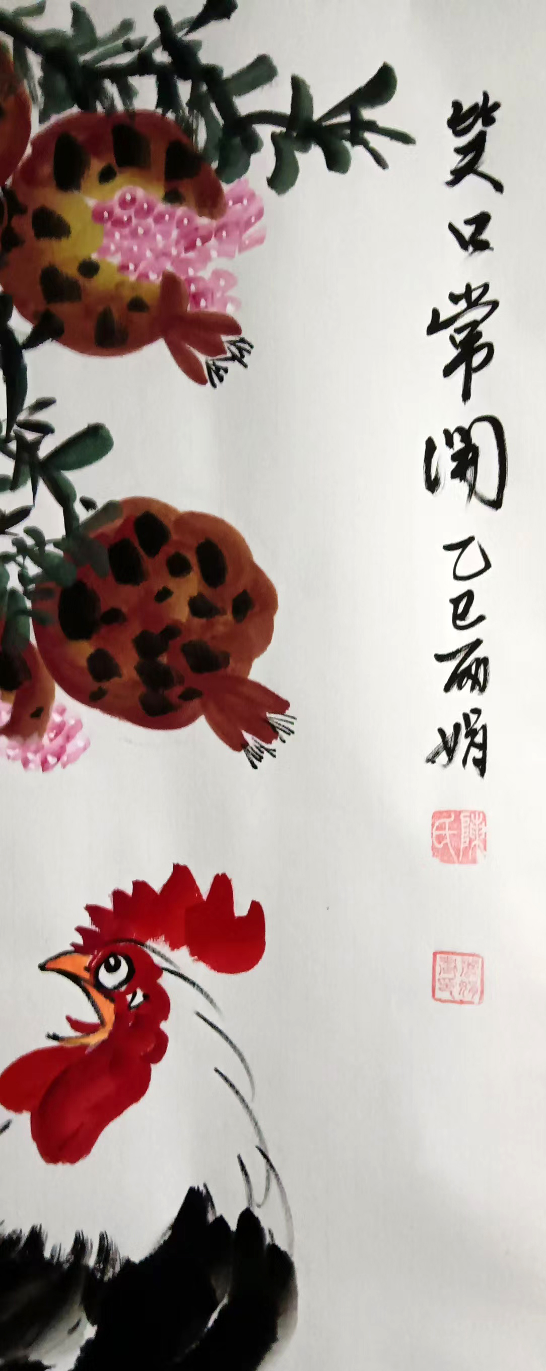 -鲜红的鸡冠与石榴的红果相互映衬,象征着"鸿运当头"、"官运亨通"。