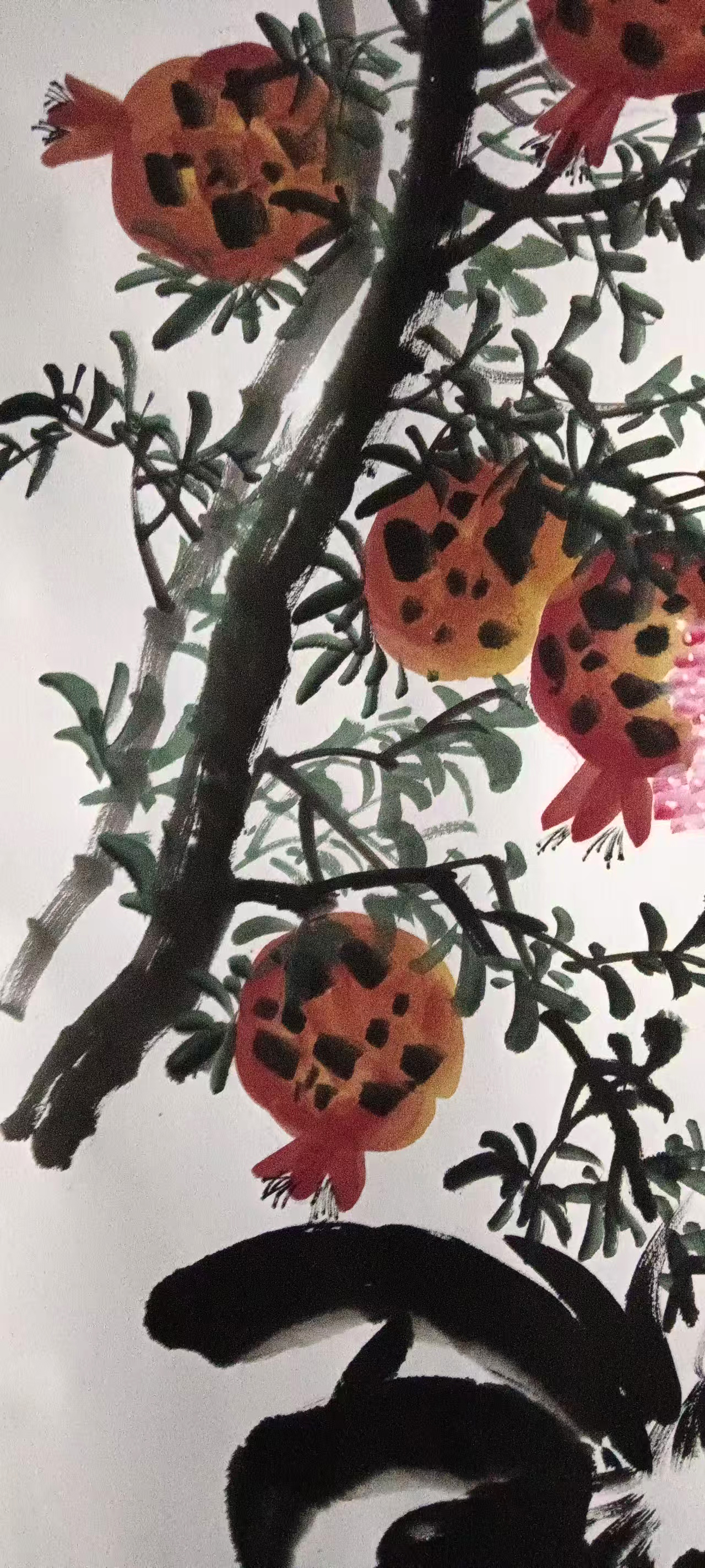 -石榴果实饱满,籽实众多,象征着"多子多福"和"人丁兴旺"。-果皮绽开露出晶莹的籽实,形象地表现了"笑口常开"的主题寓意生活美满、充满喜悦。